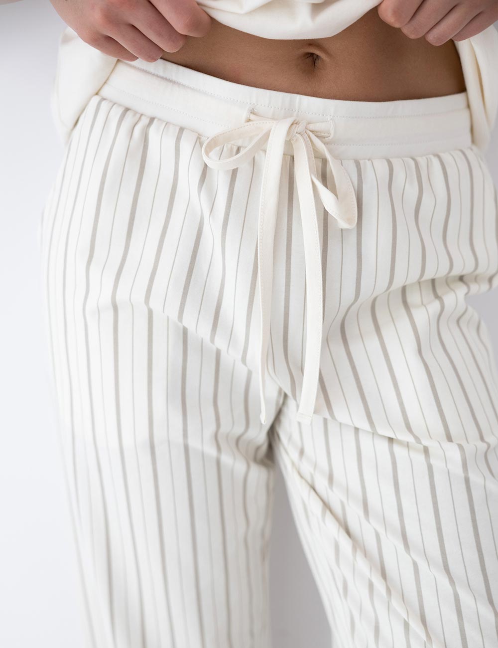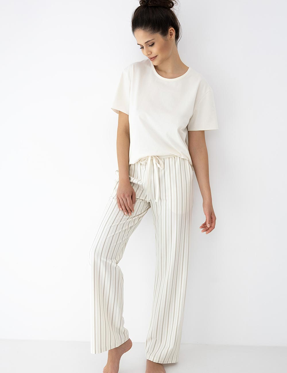 Комфортная пижама Sensis SOLEIL- это идеальное сочетание натурального хлопка, удобного кроя и модного дизайна. В комплекте однотонная футболка и брючки с ненавязчивым полосатым принтом принтом.