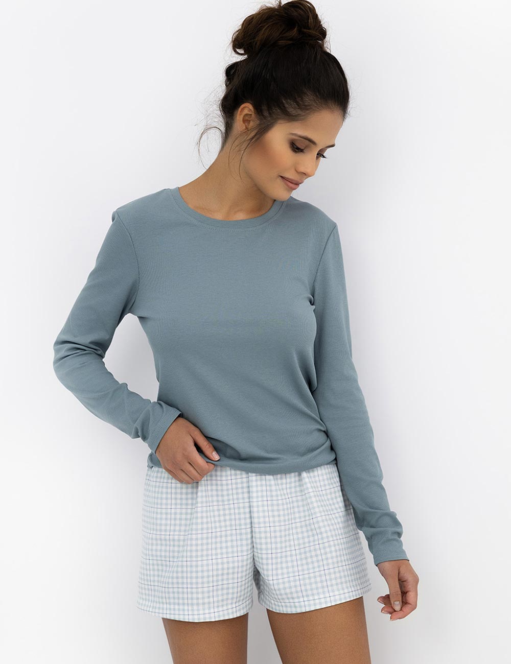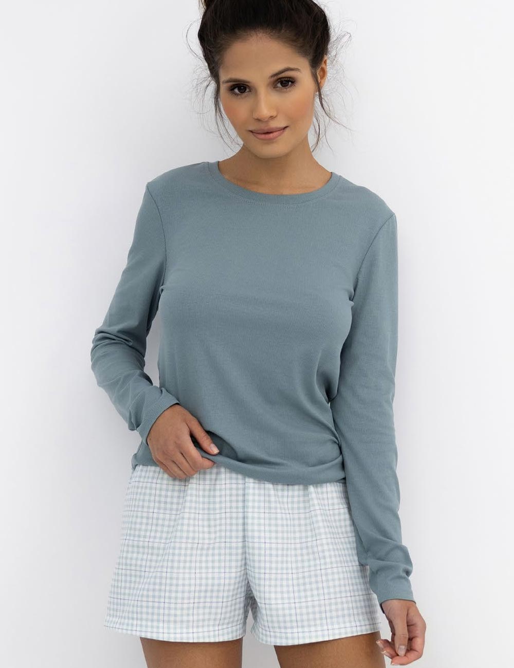 Пижама KAITLYN от польского бренда Sensis сочетает в себе однотонную кофту из смесового материала модала с хлопком и хлопковые шорты в мелкую клетку. Идеально подходит для теплых ночей или уютного домашнего утра.