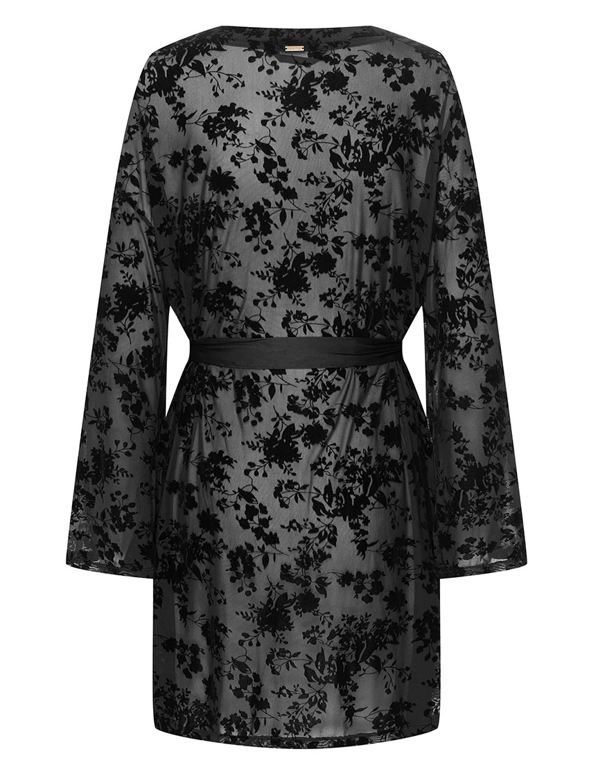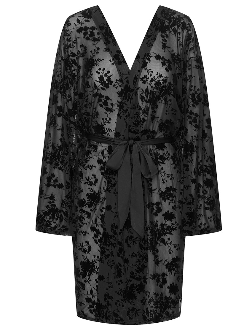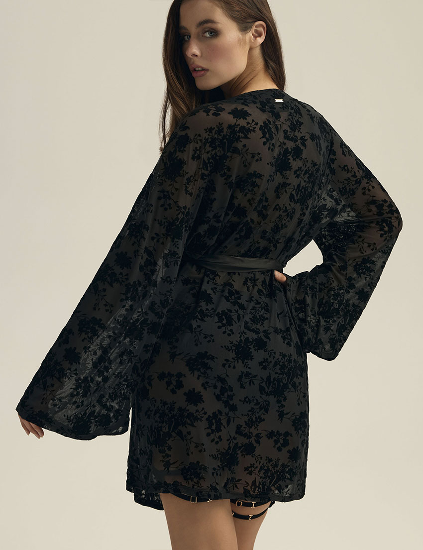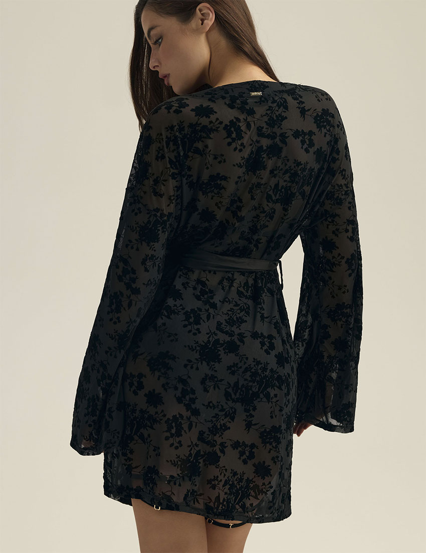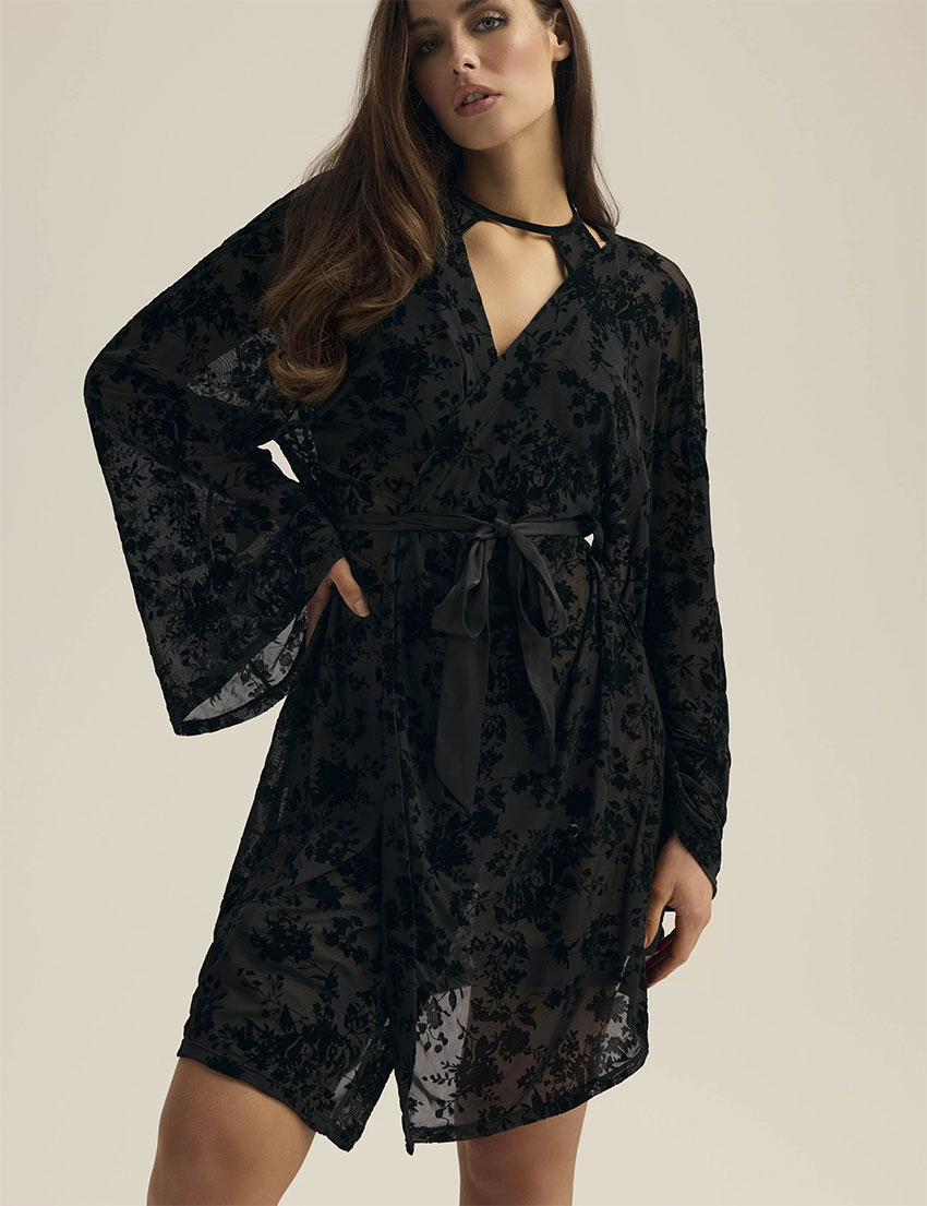 Черный пеньюар ZEQUINE 44179 от Esotiq из полупрозрачного кружевного полотна с бархатистым велюровым узором. Свободные широкие рукава добавляют изящество образу, а атласный пояс подчеркивает талию. Модель создана для особенных моментов, когда хочется сочетать домашний уют с каплей роскоши и притягательной загадочности.