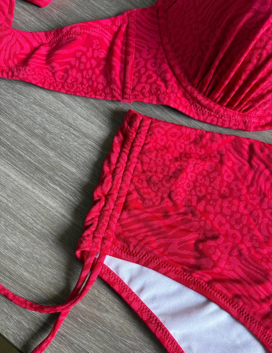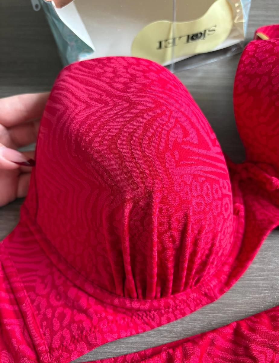 Женская купальная пара AM89 из итальянской коллекции Sielei ANIMAL MIX - яркая и эффектная, изготовлена в вишневом цвете из эластичного полотна с модным анималистическим принтом. Удобный формованный бюстгальтер и купальные трусики с завязками по бокам хорошо садятся по фигуре, позволяя с комфортом плавать и играть в пляжные игры.