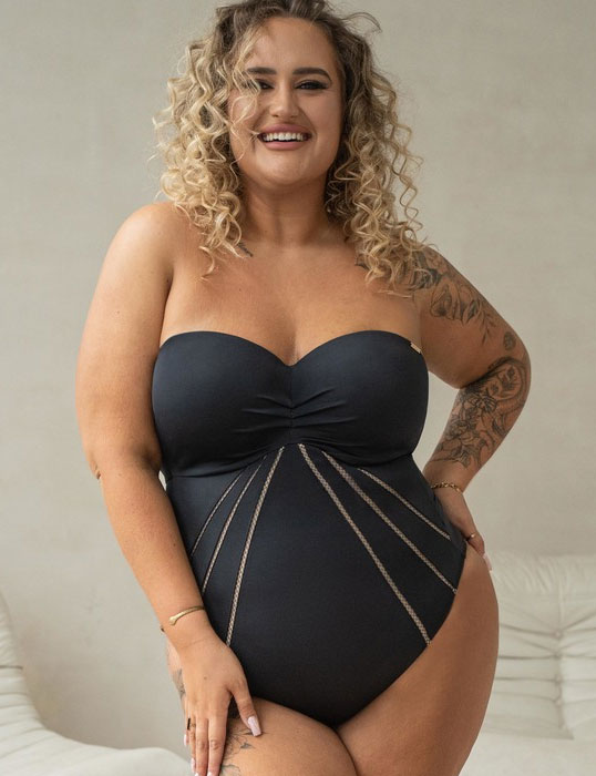 Слитный купальник бандо Kris Line SOLAR body MHM чёрного цвета — стильный вариант с утягивающим эффектом. Формованная чашечка бандо подчёркивает верх груди, приподнимает и собирает по бокам, создавая иллюзию большего объёма. Съёмные бретели открывают плечи для ровного загара. Ажурные сетчатые вставки на животе визуально стройнят фигуру. Идеален для тех, кто хочет выглядеть эффектно у воды!
