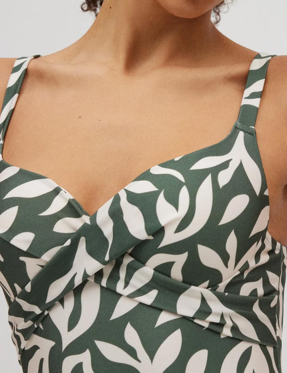 Совместный купальник от испанского бренда Ysabel Mora модель ILHA DE MEL 83102 из быстросохнущего эластичного полотна оливкового цвета с контрастным цветочным узором. Лёгкий корректирующий эффект в области живота поможет скрыть недостатки фигуры или получить дополнительную поддержку и комфорт на пляже или у бассейна.