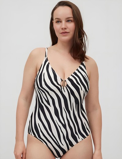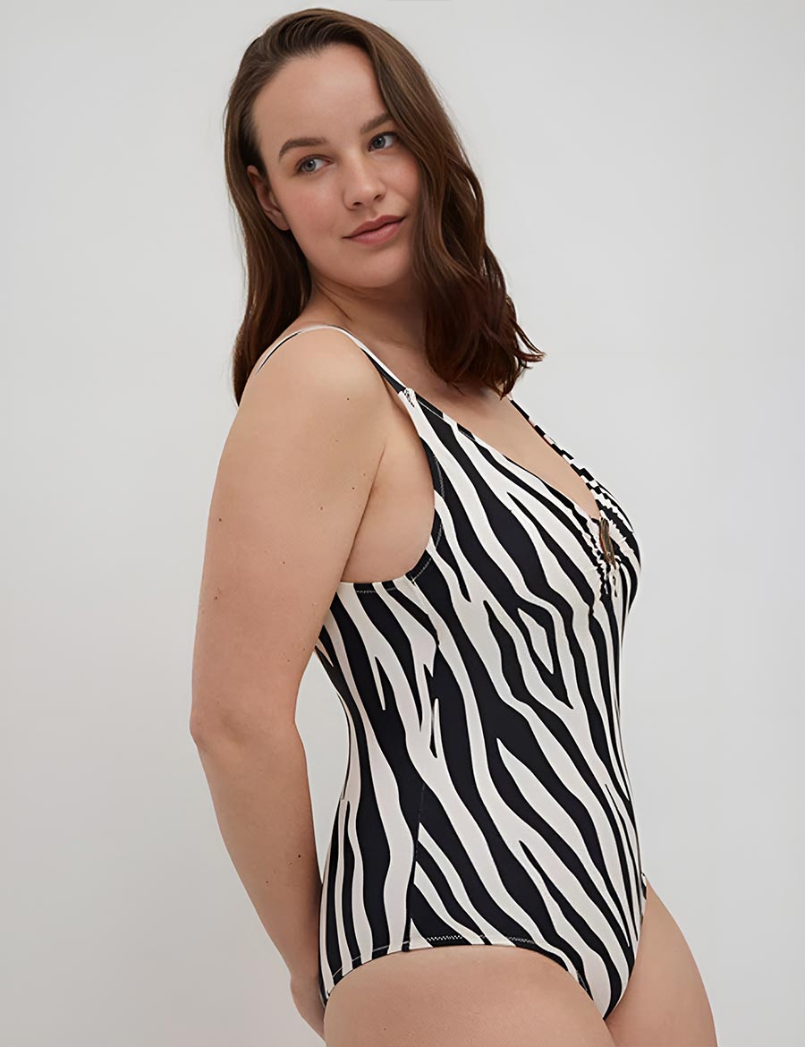 Чёрно-белый купальник от испанского бренда Ysabel Mora модель ANTAO 83076 выполнен из быстросохнущего эластичного полотна с анималистическим принтом «зебра». Лёгкий корректирующий эффект в области живота поможет скрыть недостатки фигуры или получить дополнительную поддержку и комфорт на пляже или у бассейна.