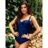 Закрытый купальник насыщенного зеленого цвета, с формованными чашками на каркасах, широкие несъемные бретели регулируются по длине.