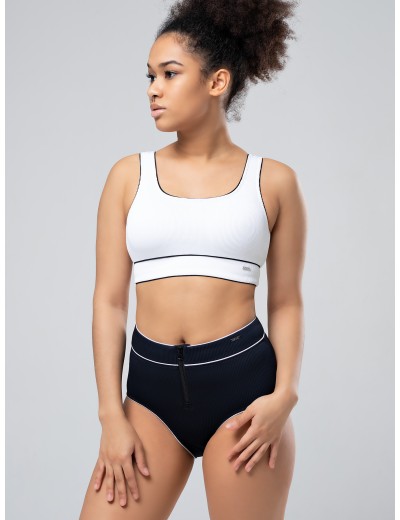 Чёрно-белый купальник от итальянского бренда Opium модель SF-55 состоит из белого топа и высоких чёрных плавок на подкладе, спереди на молнии. Выполнен из эластичной ткани «в рубчик», которая выглядит модно и хорошо сохраняет форму. Подходит для активных пляжных игр и расслабляющего отдыха на побережье.