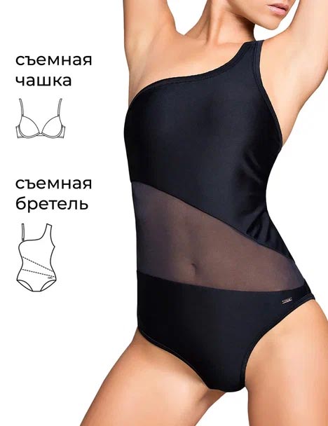 Со съемными формованными поролоновыми вкладышами. Фигурная вставка из полупрозрачной сетчатой ткани также добавляет образу легкости. Модель будет великолепно смотреться на пляже и у бассейна, а если захочется активно поплавать, то для уверенности есть дополнительная съёмная бретель.