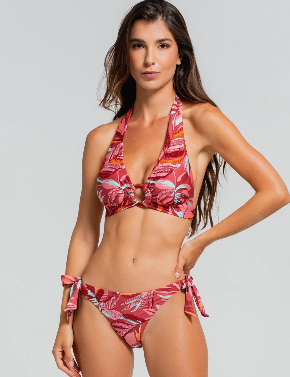 Бюстгальтер пляжный от колумбийского бренда Cosita Linda модель CLB26047 из коллекции RAINFOREST RADIANCE выполнен из высококачественной ткани с эксклюзивными дизайнерскими аксессуарами ручной работы - эффектный узор украшен ручной вышивкой и декорирован бисером. Вместительные треугольные чашки соединяются декоративным кольцом в зоне декольте.