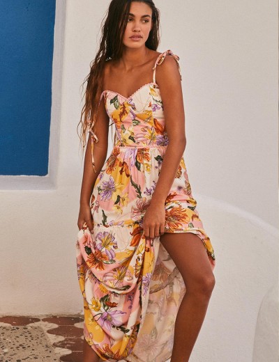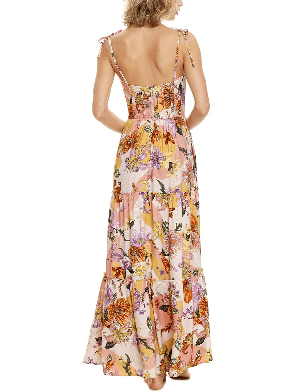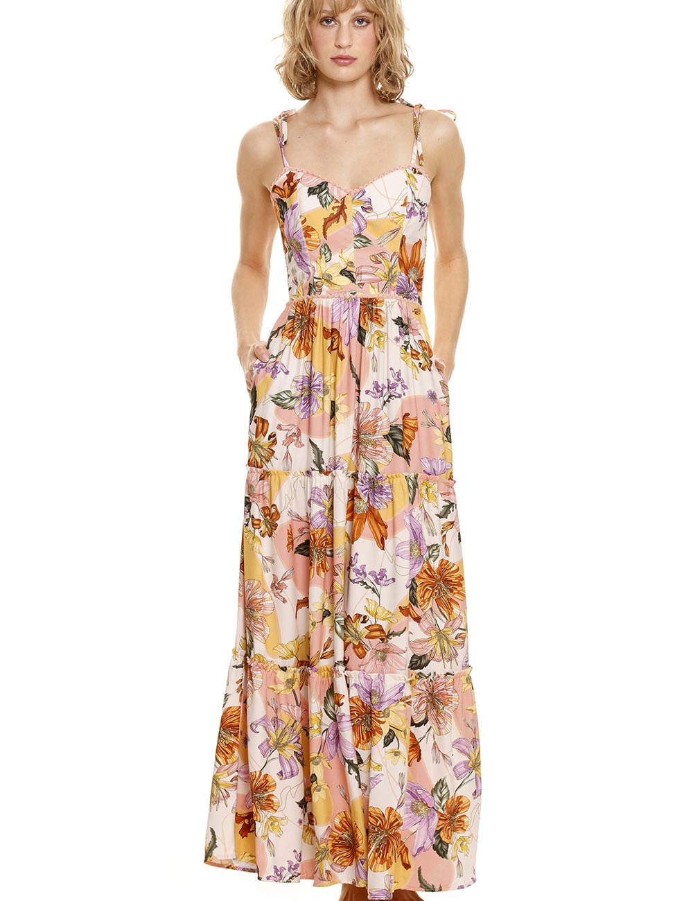 Длинное платье колумбийского бренда Agua Bendita модель 12801 SUZIE VITREO из мягкой вискозы с контрастным цветочным принтом. Регулируемые бретели на завязках придают платью форму, а легкая ткань струится, создавая воздушный силуэт.