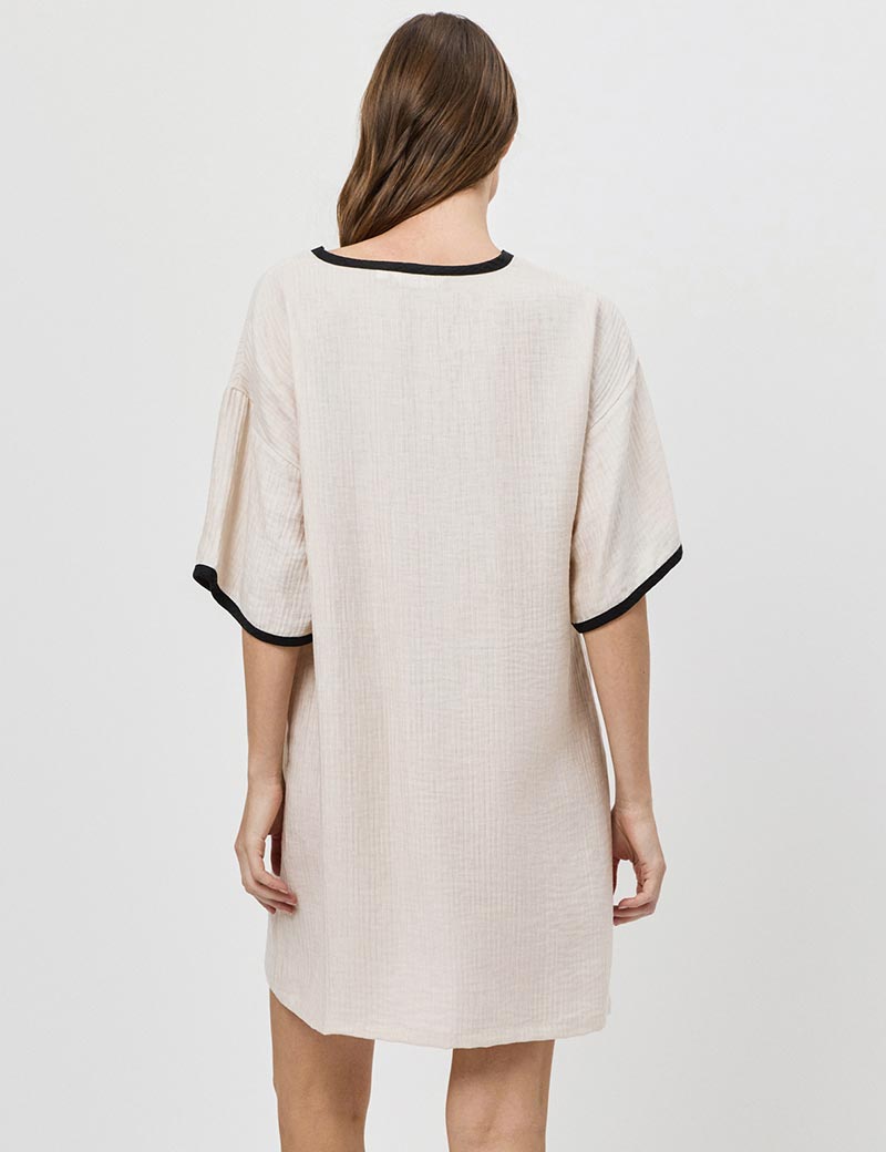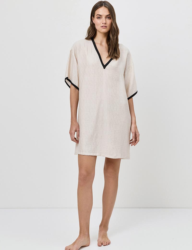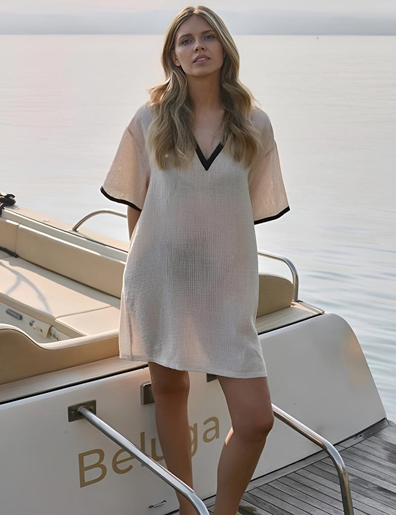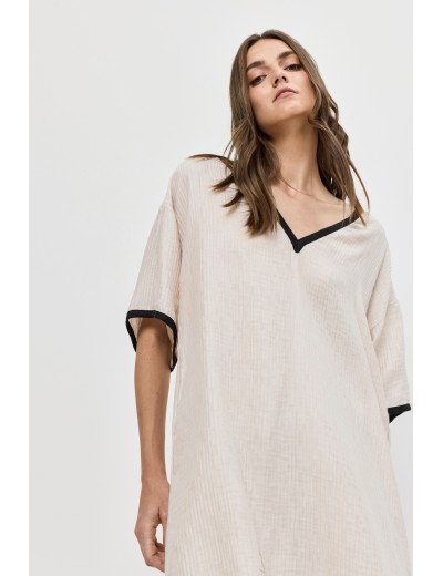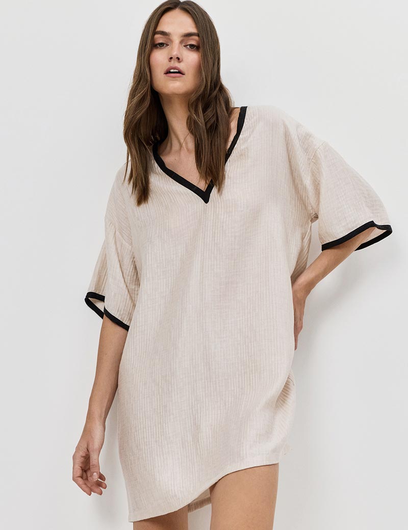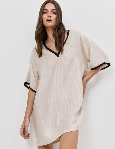 Платье-туника HORIZON от литовского бренда Aruelle — это сочетание элегантности и удобства, которое идеально подходит для спокойных прогулок или морских путешествий. Ткань с эффектом жатки придаёт образу лёгкость и элегантность, а сочетание вискозы и лиоцелла обеспечивает приятное ощущение прохлады и невесомости на коже.