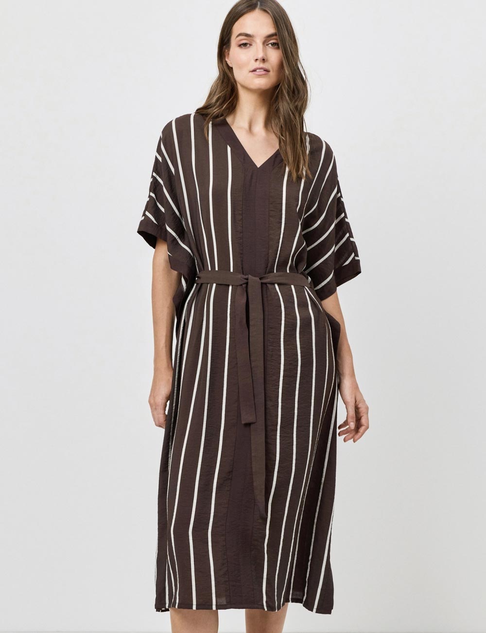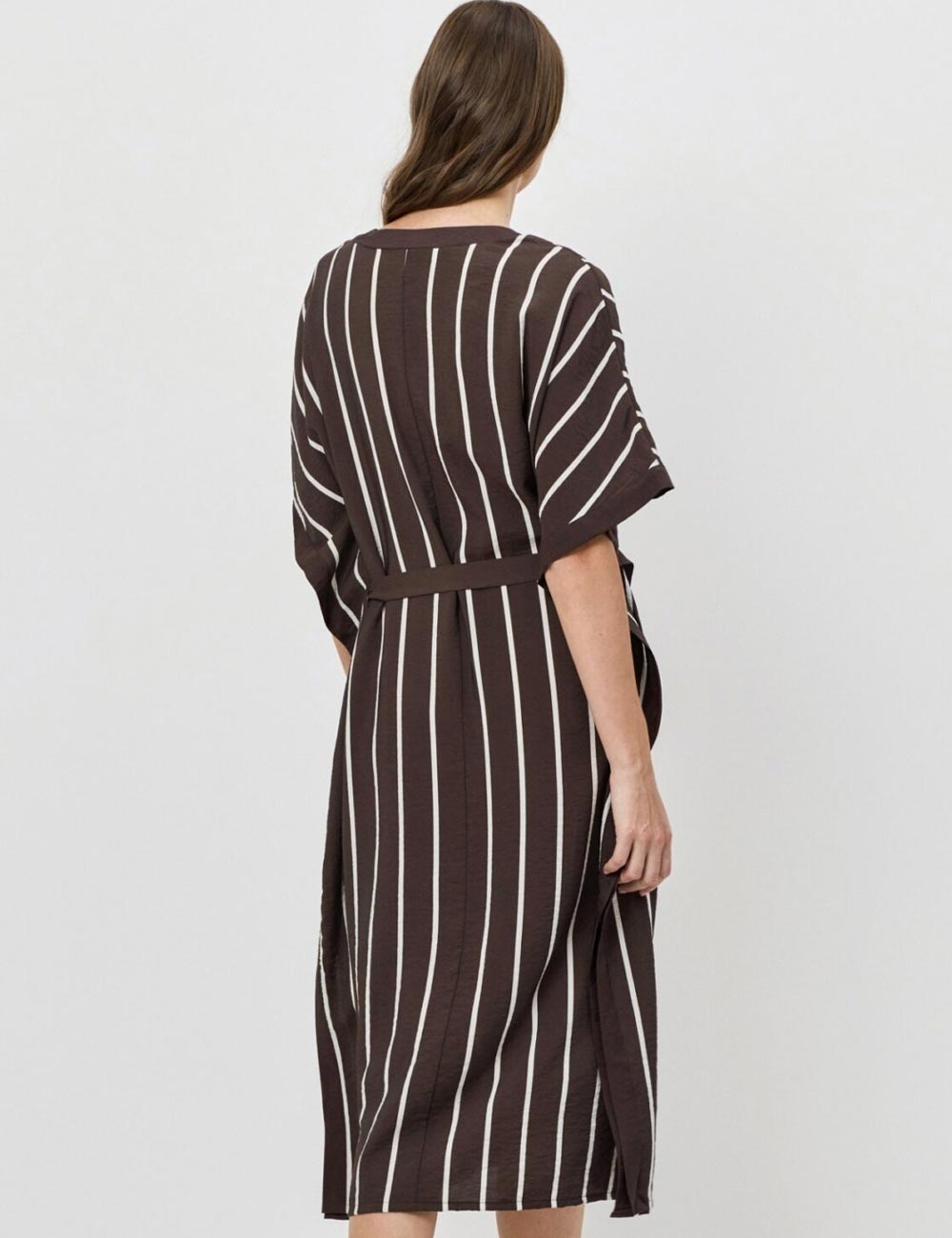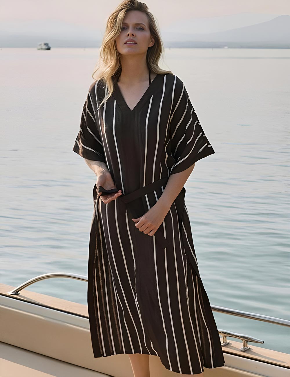 Длинное платье-туника CEDAR от литовского бренда Aruelle выполнена из креп-вискозы с добавлением нейлона в насыщенной шоколадной расцветке с вертикальными кремовыми полосками. Идеальное сочетание лёгкости и комфорта, созданное для спокойных прогулок или морских путешествий.