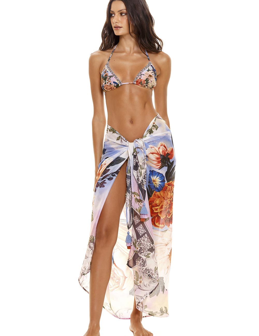 Элегантное парео колумбийского бренда Agua Bendita модель 12281 MARINE NUME украшено элегантными кисточками и ярким цветочным принтом, что придаёт ему изысканность и стиль. Идеально подходит для пляжной одежды или в качестве накидки, оно добавит нотку очарования и изысканности любому пляжному образу.