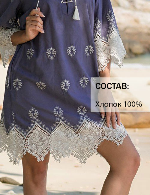 Туника короткая Mia-Amore MARSELL модель 6397 из качественного натурального хлопка с контрастной вышивкой. Горловина украшена шнуровкой. Рекомендуем романтичным леди в качестве женственного и неповторимого пляжного образа.