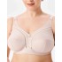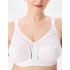 Чашка сшивная, с тройным Т-образным членением, выполнена из гладкого неэластичного трикотажного полотна. Нижняя деталь ламинирована хлопком. Отделка - кружевная тесьма с эффектом «мережки». Пояс широкий, выполнен из эластичного полотна с микрофиброй, без вертикальных упругих пластин. Бретели несъемные, регулировочный блок установлен спереди.