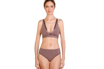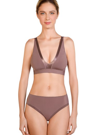 Мягкий бесшовный бюстгальтер бралетт CRYSTALL 7740 от бренда Mioocchi шоколадного цвета. Модель очень легкая, почти невесомая, принимает физиологическую форму груди, почти не ощущается на теле, обеспечивая эффект отсутствия белья. Выполнен на контрастном сочетании матовой и блестящей микрофибры, украшен мерцающими люрексовыми кантами, бронзовой фурнитурой и золотистой подвеской-аксессуаром.