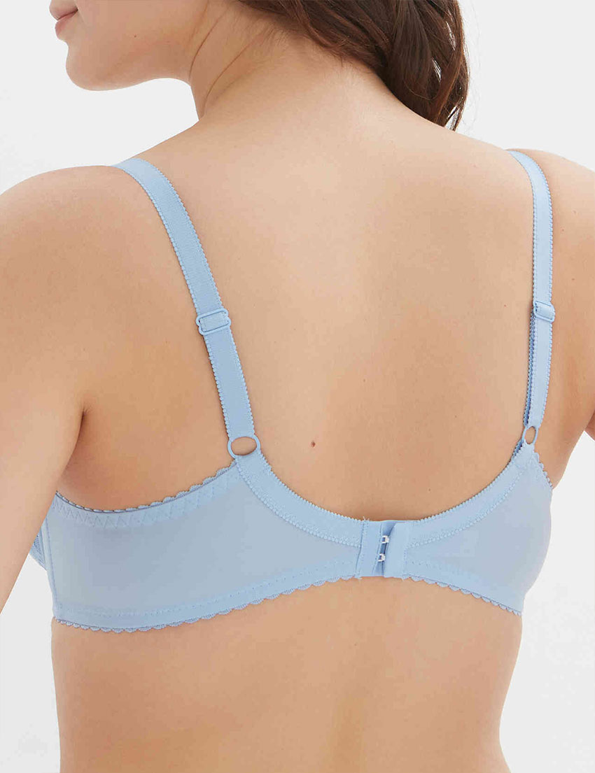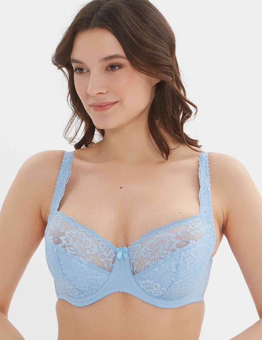 Классический голубой бюстгальтер Elli 9000 с полумягкими чашками для комфортной повседневной поддержки груди средней и большой полноты. Особенный крой чашки помогает скрыть несовершенства подмышечной области, а также придать форму груди, собрав её к центру. Выполнен из эластичного ажурного кружевного полотна и гладкой микрофибры. Делает область декольте привлекательной и элегантной.