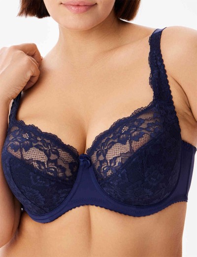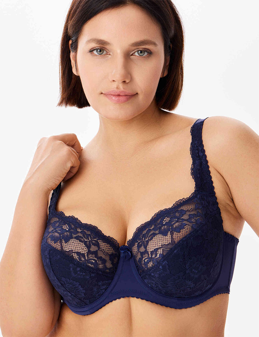 Классический темно-синий бюстгальтер Elli 9000 с полумягкими чашками для комфортной повседневной поддержки груди средней и большой полноты. Особенный крой чашки помогает скрыть несовершенства подмышечной области, а также придать форму груди, собрав её к центру. Выполнен из эластичного ажурного кружевного полотна и гладкой микрофибры. Делает область декольте привлекательной и элегантной.