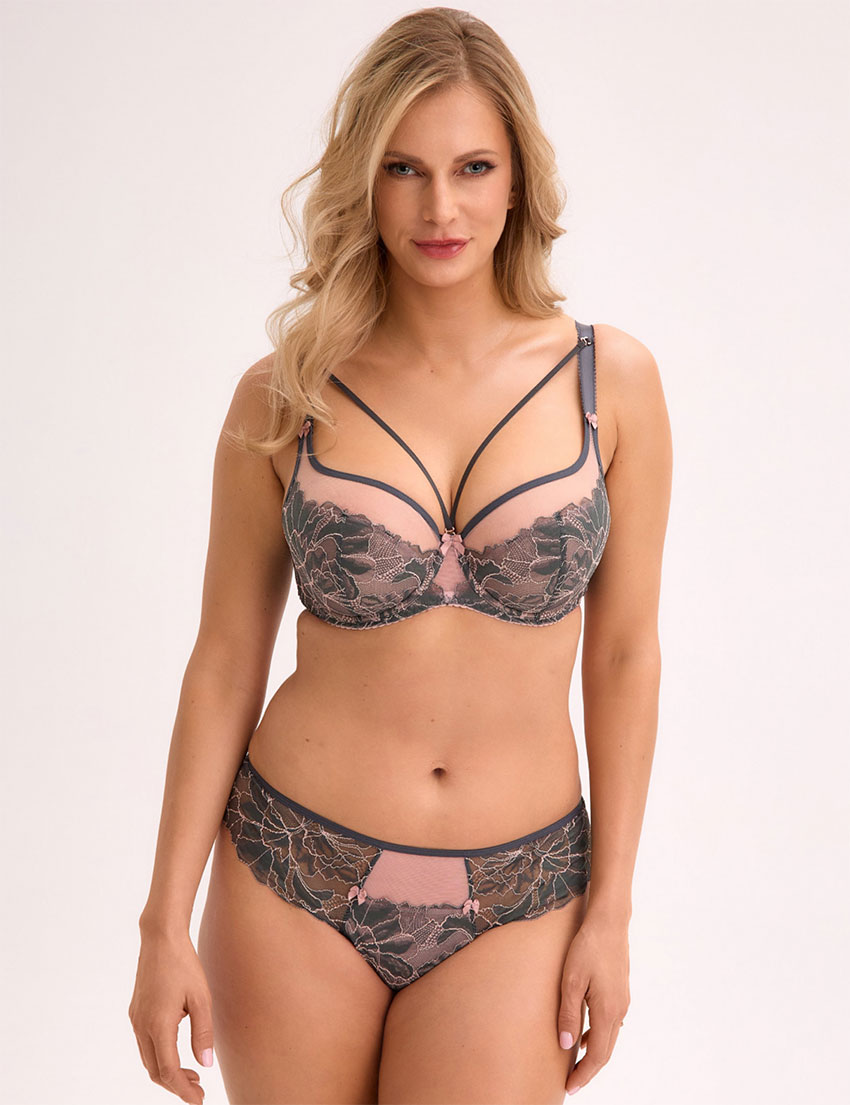 Бюстгальтер PRIYA 1318 semi-soft от Gaia сочетает нежный розовый и темно-серый цвета в современном дизайне. Верхняя часть чашки из плотного розового тюля с контрастной резинкой, нижняя — из тонкого поролона, покрытого биколорным кружевом. Идеален для средней и большой груди, обеспечивая поддержку, комфорт и романтичный вид с декоративной стрэп-бретелью.