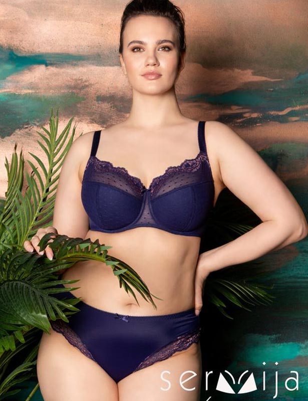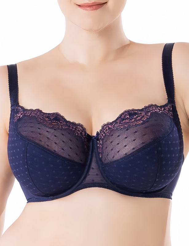 Бюстгальтер с полумягкими чашками белорусского бренда Sermija модель ROZALIJA 182-21-L в модном цвете синий сапфир. Внешняя сторона чашечек покрыта эластичным кружевным полотном с узором «горох» и красивым цветочным кружевом по кромкам, внутри нижней детали - комфортный хлопок, обеспечивающий мягкое соприкосновение.