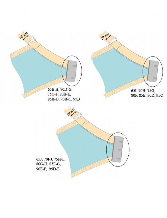 - чашка сшивная, с тройным диагональным членением, с фигурной горизонтальной линией, плавно поднимающейся к бретели, что придает чашке форму «капельки»