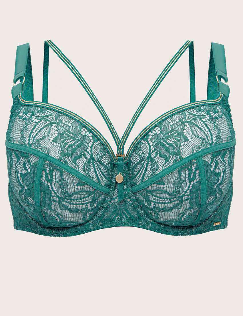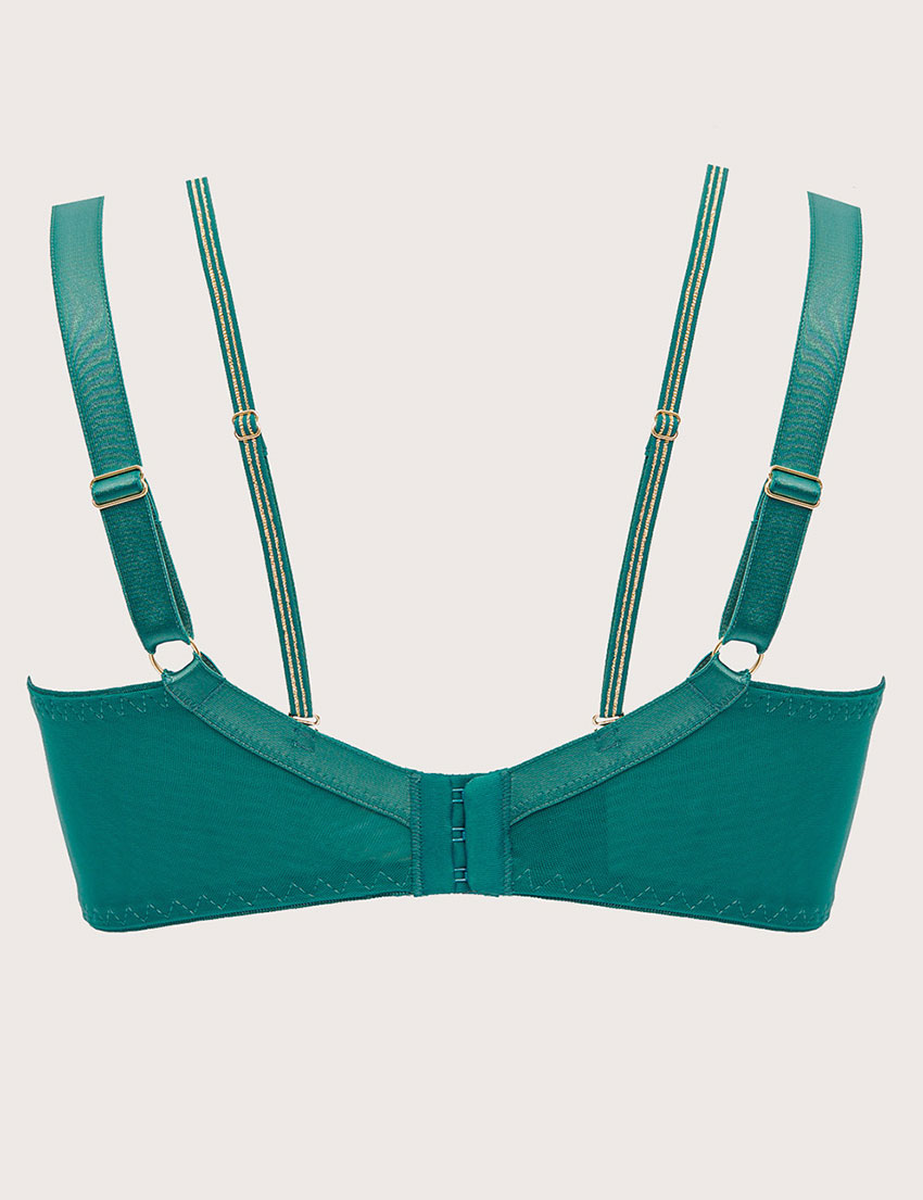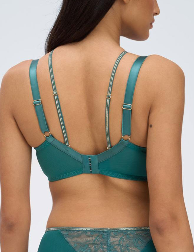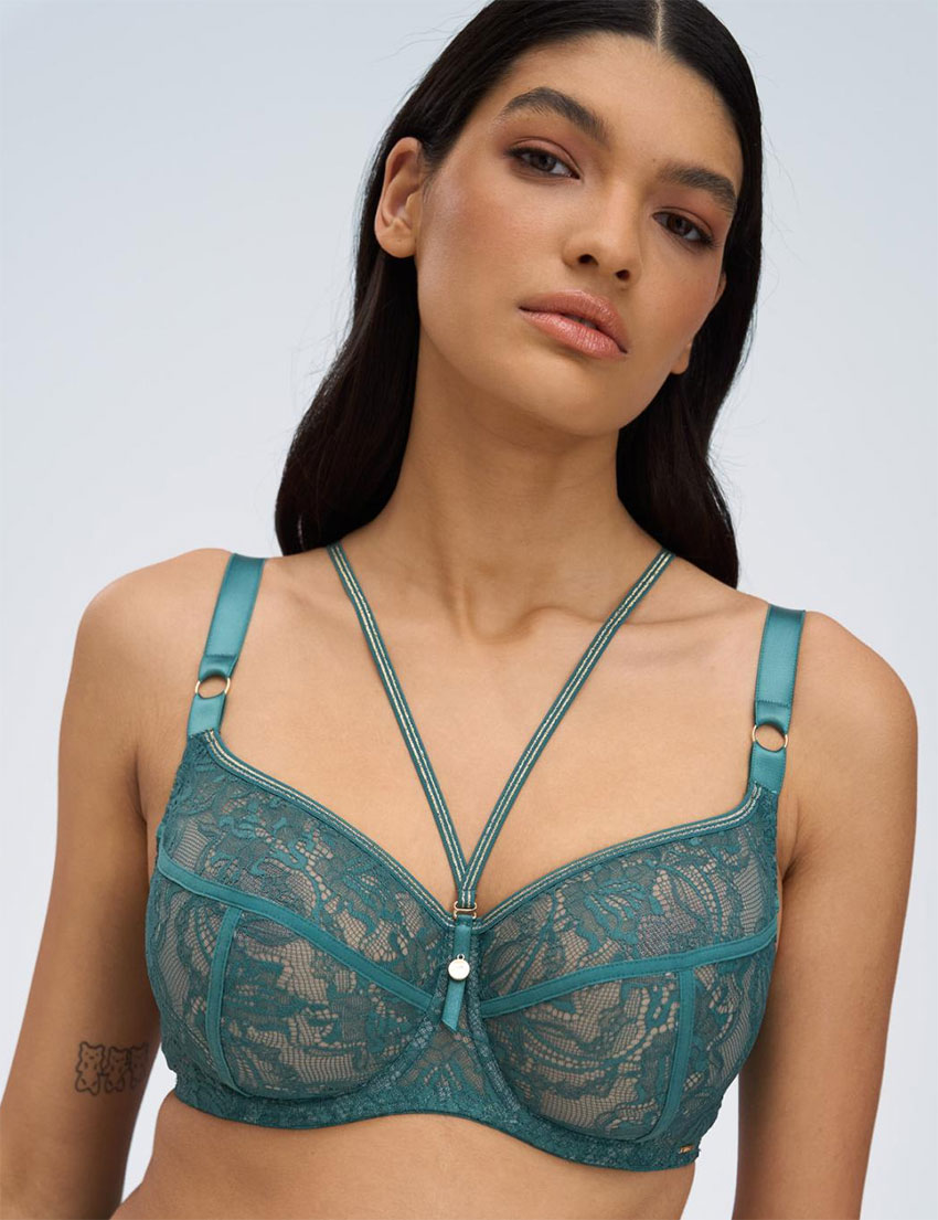 Бюстгальтер Alles из коллекции CHIARA GOLD в бирюзово-зеленом оттенке — осенний must-have с изысканным кружевом, цветочным узором и золотой люрексовой нитью в отделке. Мягкие чашки нежно формируют и приподнимают грудь, обеспечивая комфорт весь день — идеально для уверенного повседневного стиля. Декоративные стрэп-ленты позволяют экспериментировать с образами, добавляя шарм.