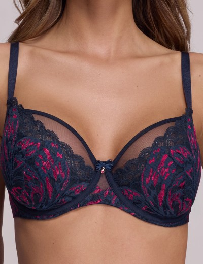Бюстгальтер Ava SENSATION модель 2183 soft в темно-синем цвете — воплощение стиля и элегантности. Мягкие чашечки из сетки и синего кружева с яркими акцентами цвета фуксии дарят комфорт, подчеркивая природную форму груди. Устойчивая боковая панель из тонкого поролона аккуратно сближает грудь, создавая соблазнительную форму под тонкой тканью блузки или платья.