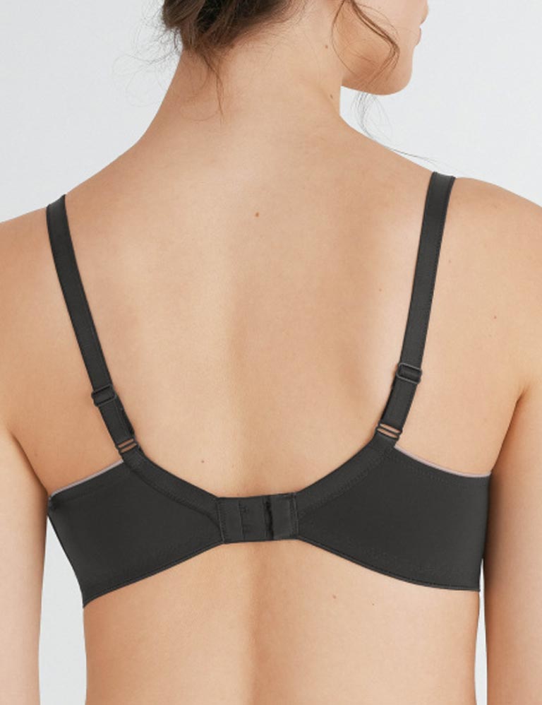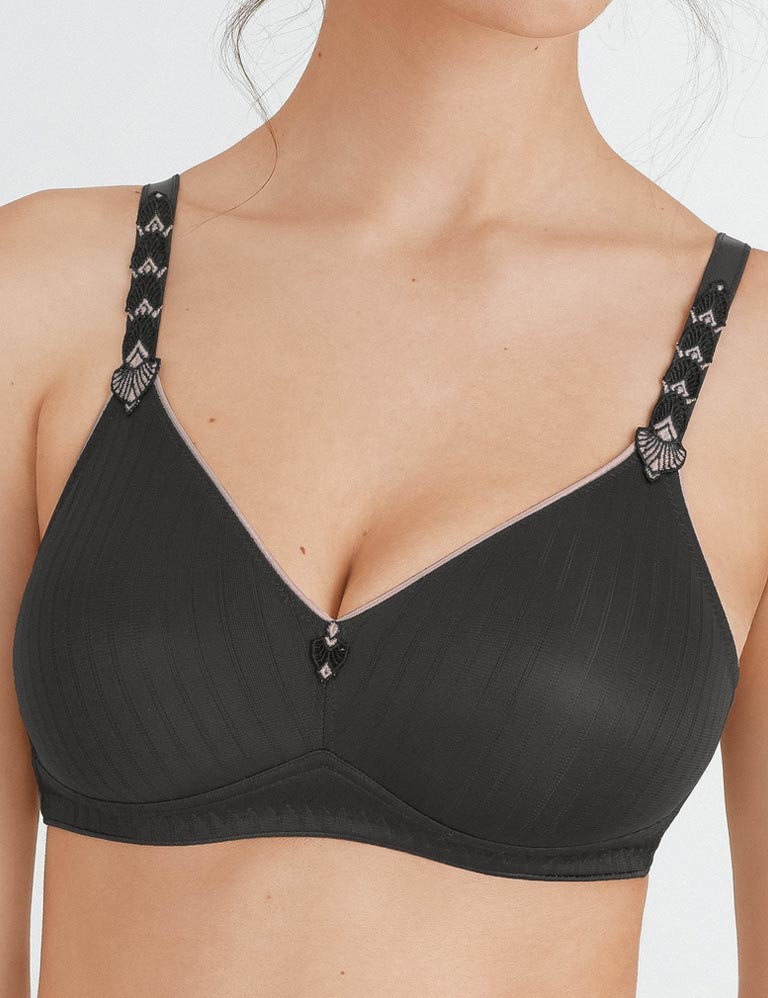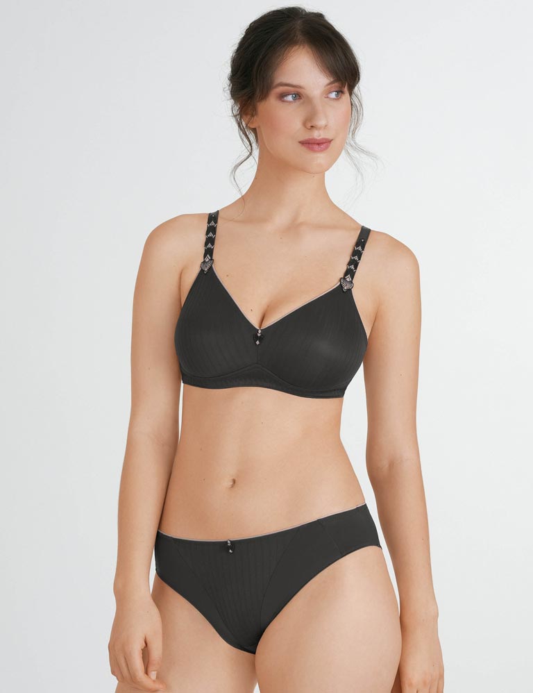 Тёмно-серый бюстгальтер Felina 203283 из коллекции ELEMENTARY с мягкой бесшовной бескаркасной чашкой. Привлекательность изделия подчёркивает тонкий рельефный узор на ткани, которая изысканно дополнена контрастной отделкой в области декольте и двухцветной вышивкой, украшающей бретели.