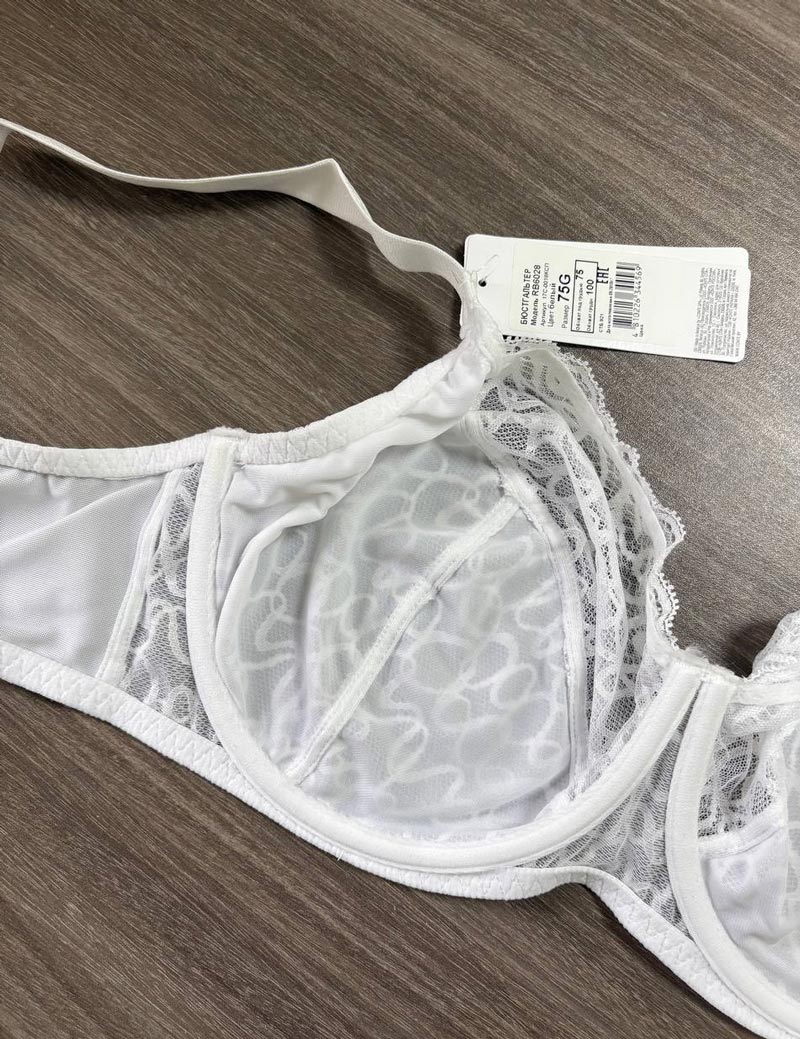На каркасах. Чашка сшивная, с тройным диагональным членением. Нижняя деталь выполнена из эластичного кружевного полотна с абстрактным выразительным рисунком на подкладке из стабилизирующего полотна, верхняя деталь - неэластичное кружево. Пояс выполнен из гладкого эластичного полотна с микрофиброй и укреплен вертикальными упругими пластинами. Бретели несъемные, регулируемые по всей длине.