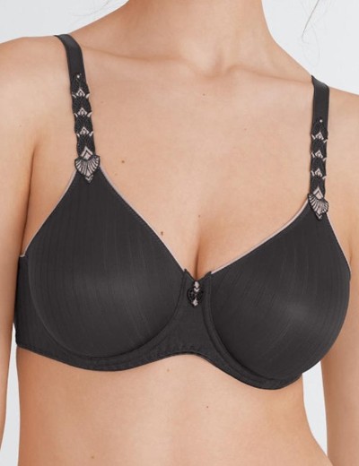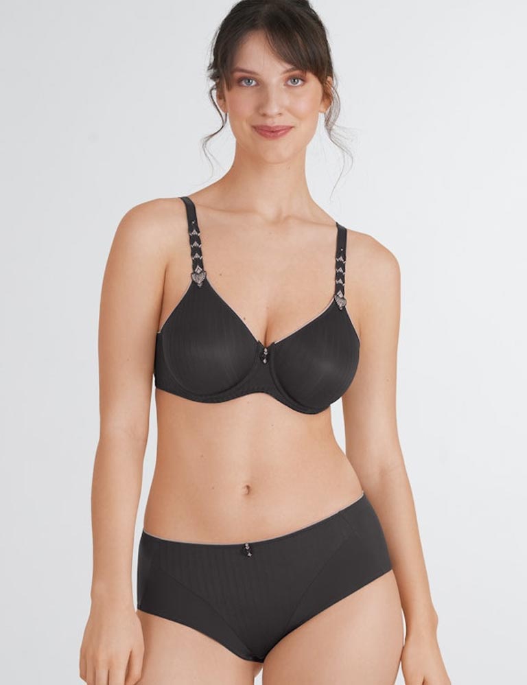 Бюстгальтер Felina 202283 из коллекции ELEMENTARY с мягкими молдированными чашками на косточках, в тёмно-серой расцветке. Чашки с термическим тиснением и гладким покрытием имеют тонкий рельефный узор на ткани, который практически не заметен под одеждой, создавая деликатный визуальный эффект. Бретели, адаптированные по ширине к размеру, украшены двухцветными акцентами из гипюра, которые придают образу особый вид.