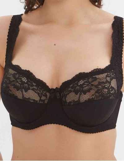 Элегантный бюстгальтер Elli 1012 в базовом чёрном цвете, с мягкими чашками и бретелями повышенного комфорта. Скрытый боковой подкрой формирует красивую подмышечную область и дополнительно поддерживается тонким поролоном. Изготовлен из гладкой бархатистой микрофибры и кружева, обеспечивая комфорт и удобство в любой ситуации — идеален для повседневной носки.