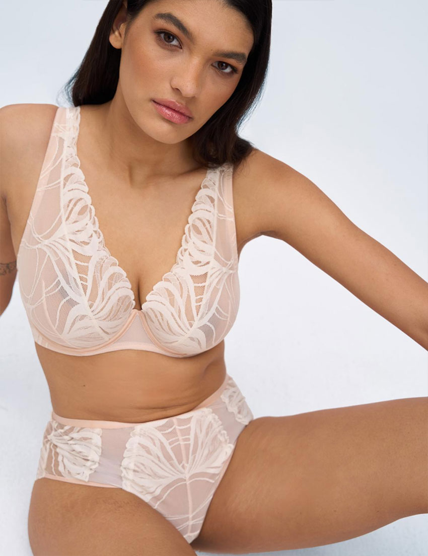 Бюстгальтер бралетт из коллекции CREME BRULEE от бренда Alles выполнен из нежного кружева золотисто-бежевых оттенков. Веерообразный узор в сочетании с прозрачной текстурой придаёт модели исключительную изысканность. Мягкие треугольные «вытянутые» вверх чашки не только приподнимают, но и собирают грудь, а фигурная верхняя часть изящно подчеркивает плечи и линию декольте.