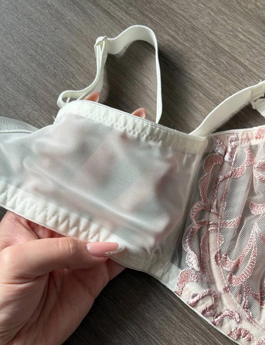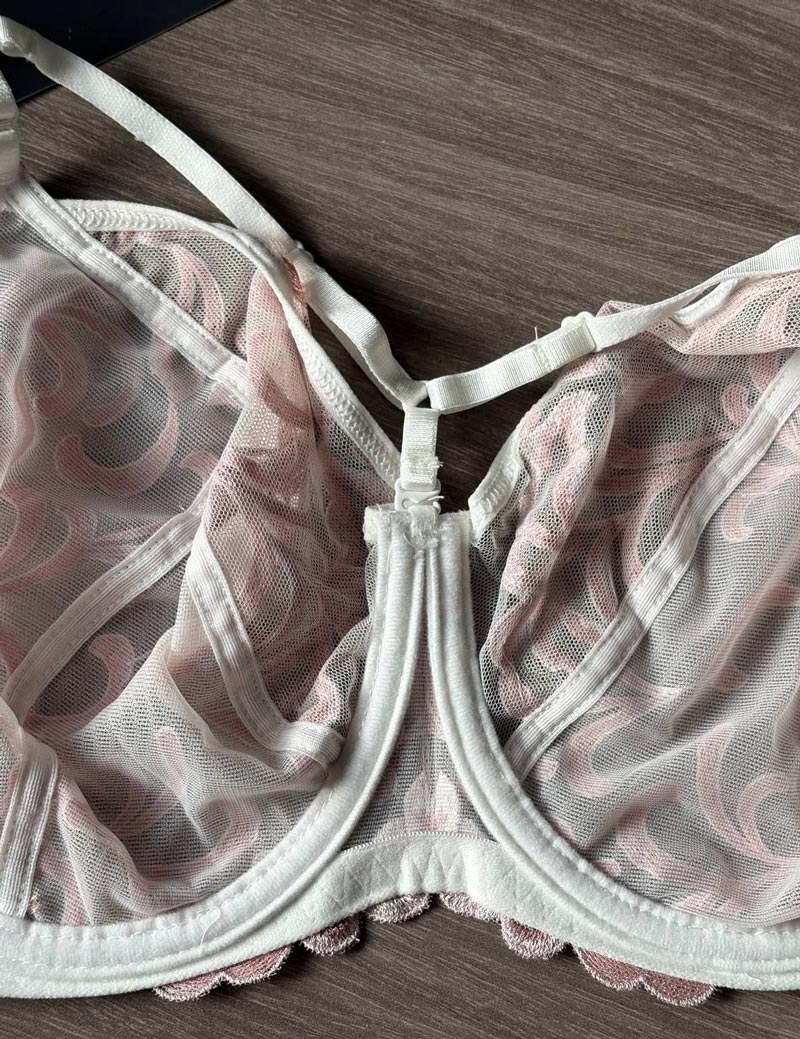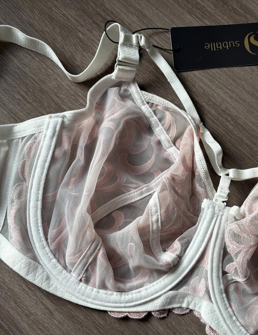 Лёгкий бюстгальтер на лето от польского бренда Subtille из коллекции MILA с мягкой чашкой и съемными стреп-бретельками. Выполнен из переливающейся блестящей пудровой вышивки на молочной сетке. Чашка дарит комфорт, привлекая внимание к природной форме груди, выглядит нарядно и женственно.