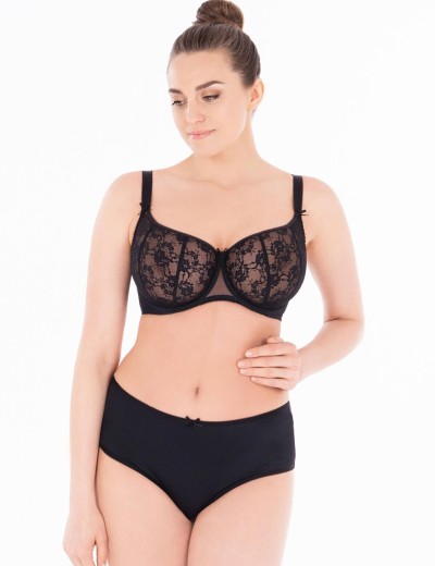Изящный белорусский бюстгальтер без поролона Honey модель H43-21-L черного цвета. Мягкая чашка из ажурного гипюра с двойными вертикальными рельефам обеспечивает поддержку бюста снизу, собирая и приподнимая грудь к центру, обволакивая ее роскошными кружевными цветами, образуя интригующее декольте. Шикарно смотрится на теле, создавая элегантный и сексуальный образ.