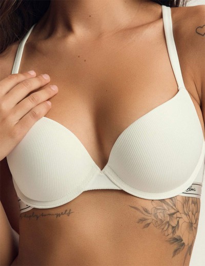 Нежный белый бюстгальтер пуш-ап ABRIA 43847 от Esotiq привносит свежесть и легкость в повседневную элегантность. Плотные гладкие чашки мягко приподнимают грудь, а эластичная микрофибра в рубчик обеспечивает комфорт при долгом ношении. Акцентная лента с логотипом Bloovii и возможность перестегивать крест-накрест бретели добавляют современный спортивный штрих к классическому стилю.