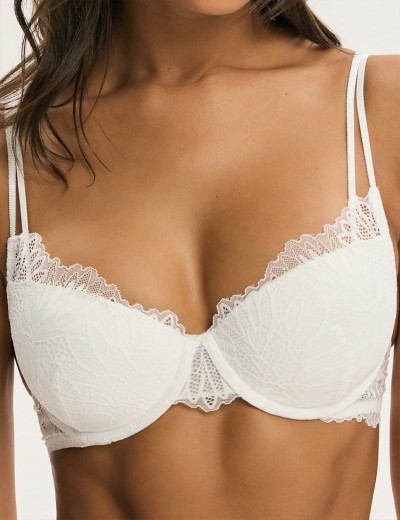 Кремовый бюстгальтер Esotiq CELESTE модель 43975 с эффектом пуш‑ап — это словно чистый, сияющий штрих к вашему гардеробу: он освежает кожу, выглядит свежо и элегантно, а кружево привлекает внимание своим узором; конструкция красиво приподнимает грудь, создавая более пышное декольте.