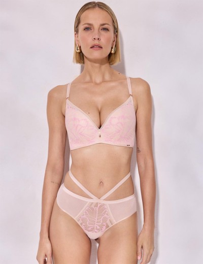 Элегантный бюстгальтер GLOSSY IRIS SUPER P-UP Beige/Pink от бренда Alles подчеркивает женское декольте, приподнимая и собирая грудь, что визуально увеличивает бюст до двух размеров. Конструкция без косточек обеспечивает максимальный комфорт, а уникальное гладкое цветочное кружево и сетчатая отделка создают элегантный стиль. Идеально подходит для любых случаев как базовое нюдовое белье.