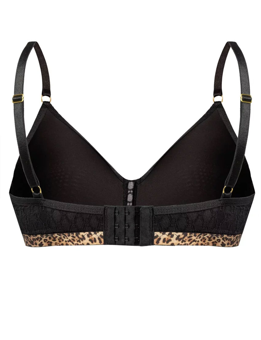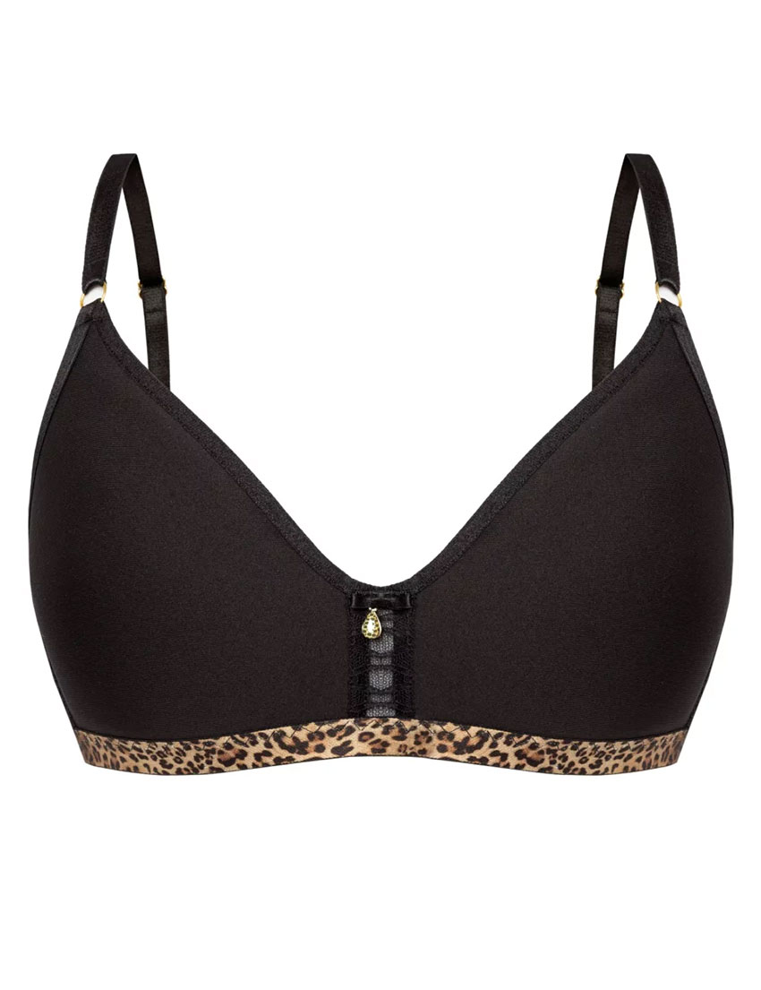 Черный бюстгальтер спейсер от бренда Mefemi из коллекции TRISTANE — без косточек, с отделкой низа под леопардовый принт, воплощает легкость и элегантность. Чашки из 3D spacer-полотна дышат, обеспечивая отличную циркуляцию воздуха и комфорт весь день. Внешняя сторона чашек гладкая, спинка из сетки с фантазийным рисунком добавляет игривый шарм. Пробуждает уверенность и стиль в повседневных моментах.