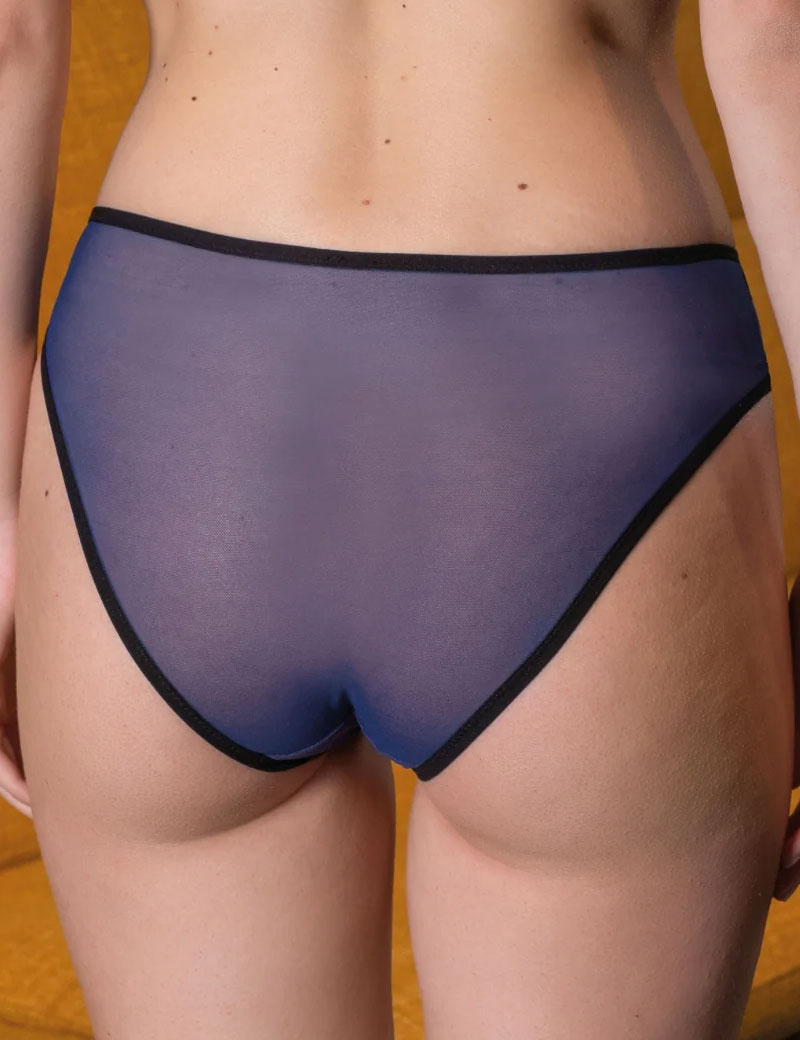 Модное белье в комплекте из коллекции Sielei BAROQUE модель 78265B nero - это бюстгальтер-триангул с мягкой чашкой без косточек и трусики-слипы со средней линией талии. Выполнен из синей сетки с бархатистым черным флокированным напылением.