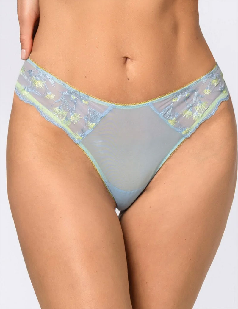 Комплект женского белья Sielei 79587 из коллекции EMILY в нежной голубой расцветке из вышивки по сетке, включает бюстгальтер с формованной чашкой без косточек и трусики-бразилиана со средней посадкой.