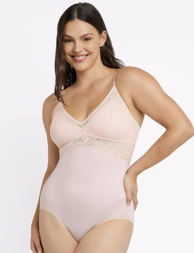 Моделирующее боди Maidenform модель DMS097, средней степени коррекции с мягкими бескаркасными чашками. Выполнено из гладкой шелковистой микрофибры в песочно-бежевом цвете. Эффективно сглаживает контуры тела, делает силуэт подтянутым.