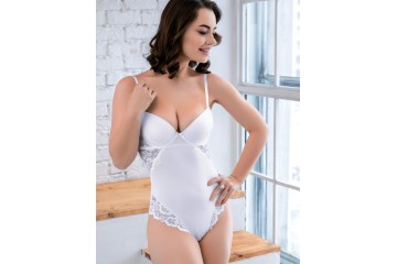Моделирующее боди из классической коллекции ВИВИАН белого цвета, на каркасах. Формованная полая чашка конструкции Roma от ТМ Mioocchi, без эффекта пуш-ап, с боковыми упругими пластинам и застежкой на крючки сзади. Бретели несъемные, регулируемые по длине.