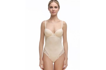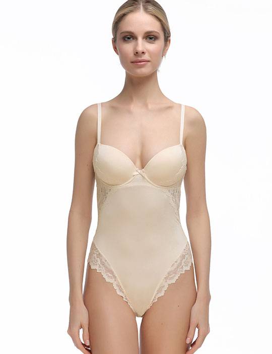 Моделирующее боди из классической коллекции ВИВИАН нежного пудрового оттенка, на каркасах. Формованная полая чашка конструкции Roma от ТМ Mioocchi, без эффекта пуш-ап, с боковыми упругими пластинам и застежкой на крючки сзади. Бретели несъемные, регулируемые по длине.