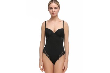 Моделирующее боди из классической коллекции ВИВИАН черного цвета, на каркасах. Формованная полая чашка конструкции Roma от ТМ Mioocchi, без эффекта пуш-ап, с боковыми упругими пластинам и застежкой на крючки сзади. Бретели несъемные, регулируемые по длине.