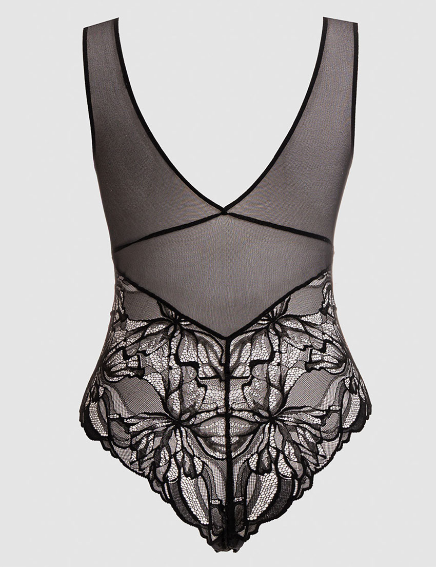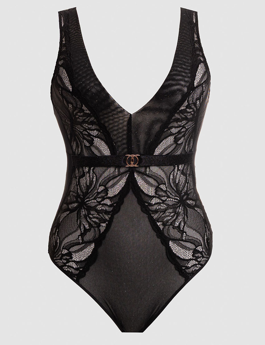 Боди Alles из коллекции THE ICON идеально облегает фигуру, нежно обволакивая тело и подчеркивая каждое движение. Выполнено из черного кружева с цветочным узором и полупрозрачного тюля с едва заметным блеском, дополнено золотистой фурнитурой и декоративным поясом из ленты. Смелый дизайн сочетает чувственность и утонченность, подходя как для особых случаев, так и для повседневности.