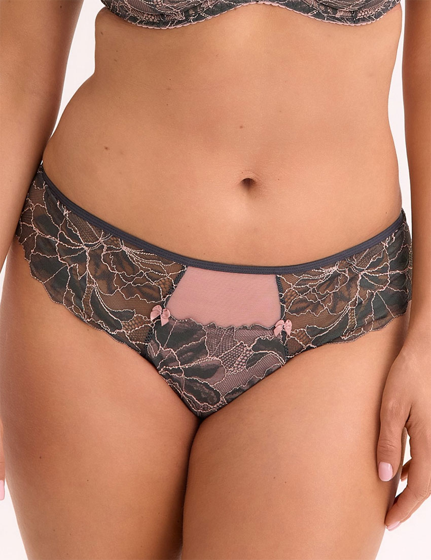 Трусики бразилиана PRIYA 1318 от Gaia выполнены из биколорного серого кружева и розовой сетки. Модель удобно сидит на бедрах, подчеркивая контуры ягодиц. Подойдут девушкам, предпочитающим открытый и сексуальный фасон белья, — для повседневного комфорта с ноткой соблазна.