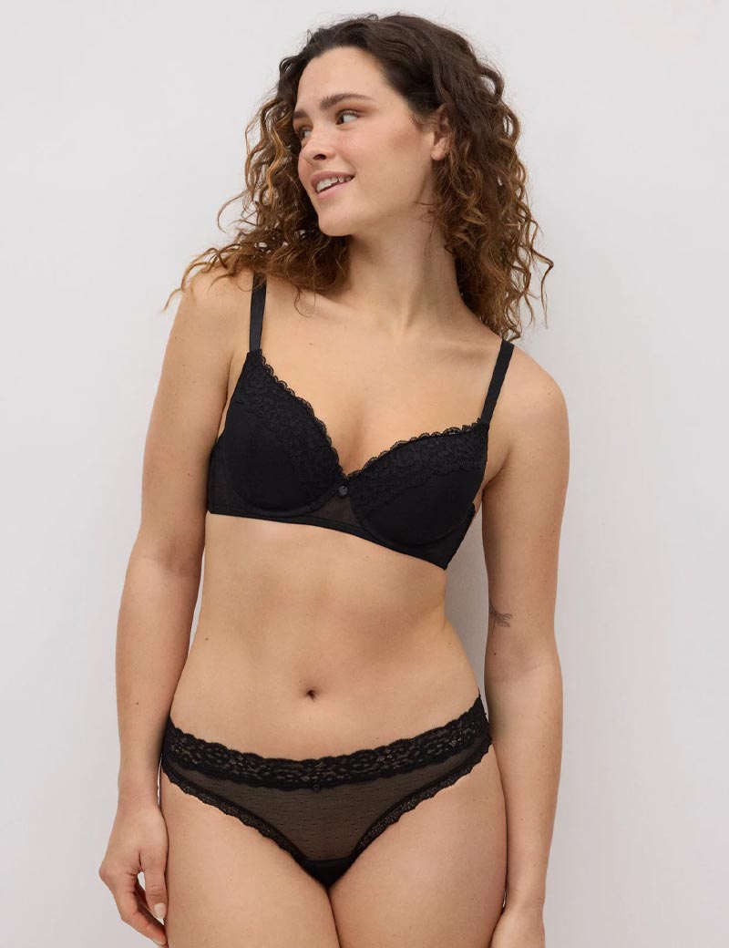 Трусики от испанского бренда Ysabel Mora модель 10725 выполнены из полупрозрачной сеточки с кружевной отделкой в чёрном цвете. Модель бразилиано подчёркивает изгибы бедер и ягодиц, создавая сексуальный и женственный образ.