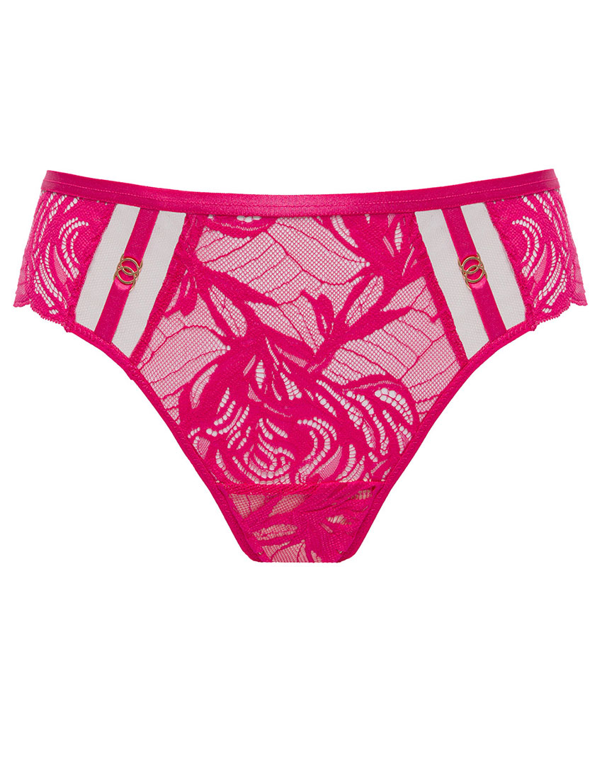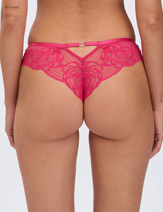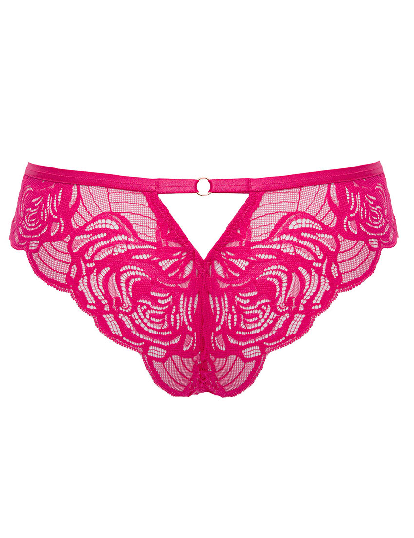 Трусики бразилиана из коллекции Alles EUPHORIC ROUGE в ярком цвете фуксия выполнены из кружевного полотна и украшены эластичной тесьмой с утончёнными ювелирными акцентами. Они подарят легкость и уверенность, добавляя игривости в ваш образ!
