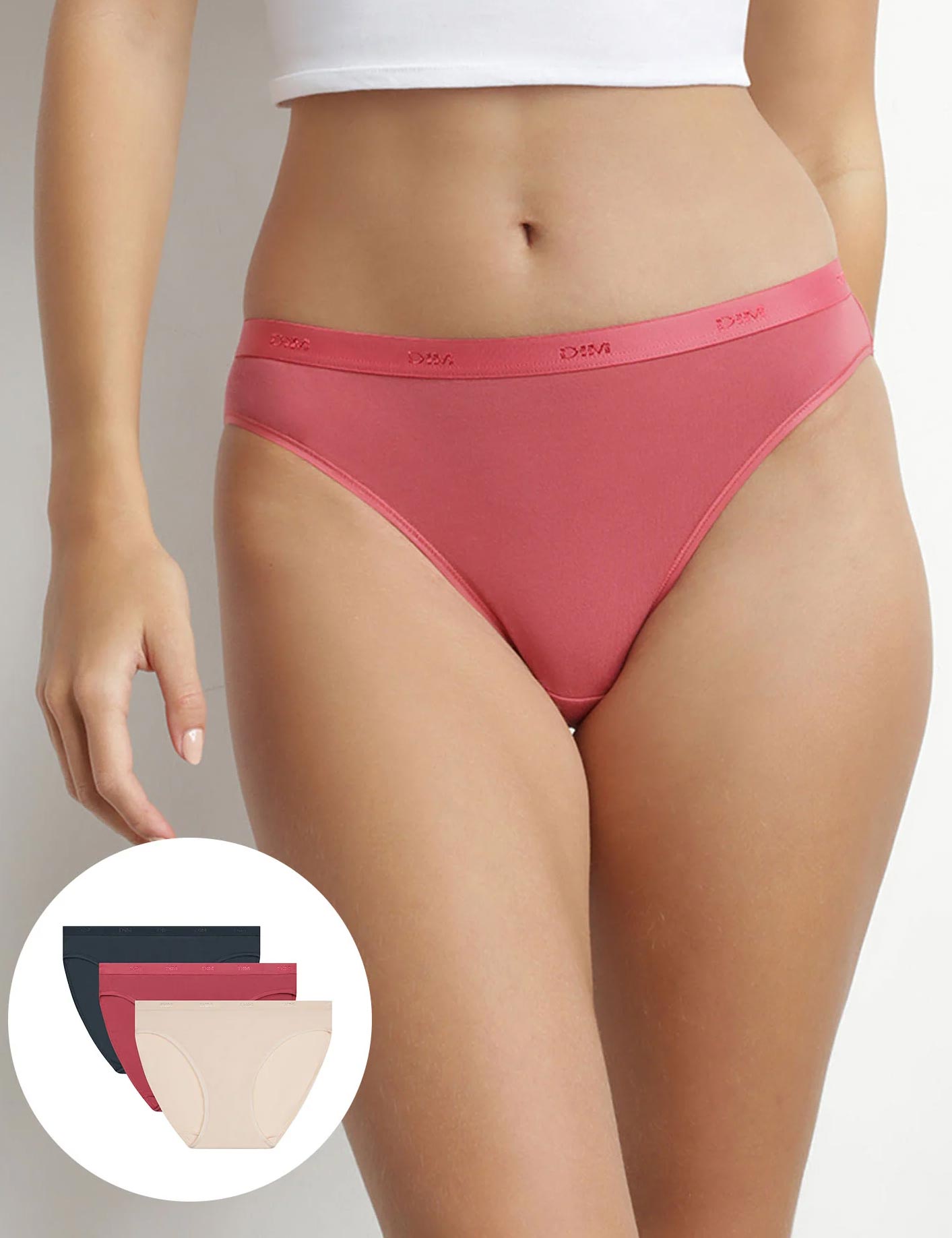 Однотонные повседневные трусики слипы 4H00/3 из коллекции Dim LES POCKETS COTON из эластичного дышащего хлопка. В комплекте 3 штуки разного цвета: бежевого, розового и тёмно-серого. Брендированная резинка в тон по линии талии. Идеально подходят для повседневной носки, обеспечивая комфорт на весь день.