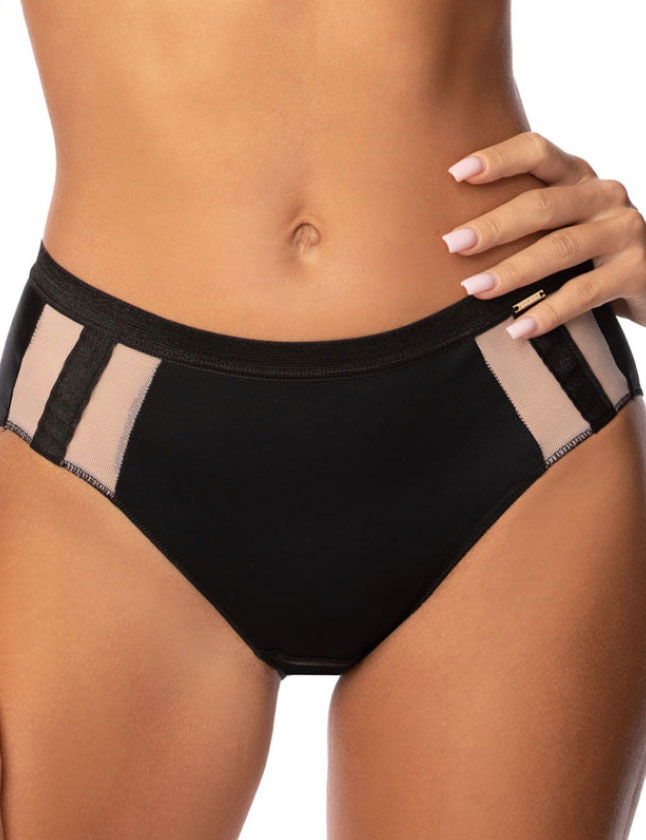 Трусы слипы Orhideja 655-000, выполненные из гладкой черной микрофибры с контрастными вставками из прозрачной телесной сетки. Модель со средней посадкой и современным дизайном, идеально подходящая для повседневной носки.