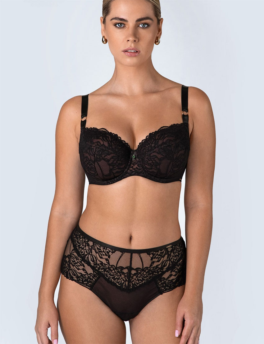 Трусики-слип с завышенной талией TRUFFLE NOIR classic от Alles — воплощение классической элегантности. Высокая талия стройнит силуэт, комфортный крой идеален для повседневного ношения. Выполнены из чёрного кружева со вставками сетки, дублированной подкладкой цвета трюфеля — соблазнительная роскошь, которая ласкает тело и взгляд.