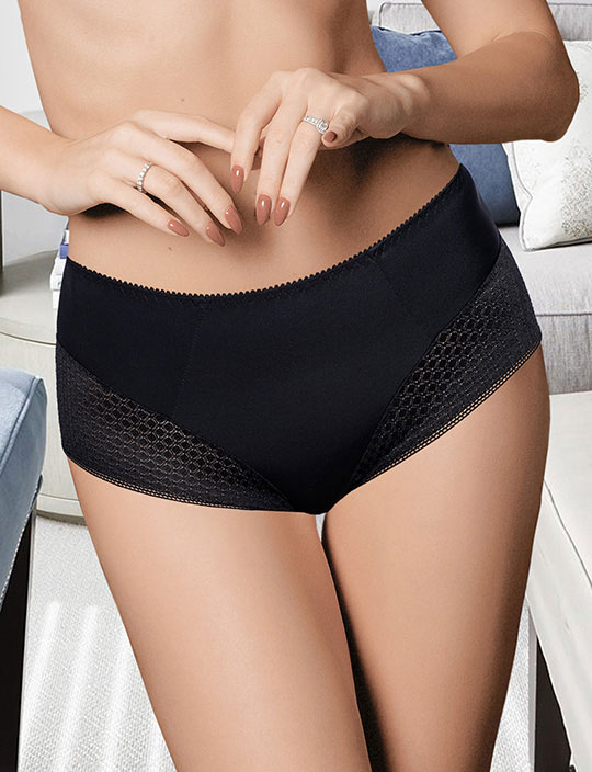 Женские слипы PERFECT 480 от Albina L — завышенная модель в чёрном цвете. Гладкая микрофибра сочетается с геометрическим кружевом, даёт лёгкую коррекцию и остаётся невидимой под одеждой. Комфорт и уверенность на весь день.